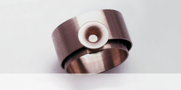 Zwei Arbeiten können uns erste Schritte aus der Introversion heraus anschaulich machen. Im einen Fall kann vielleicht noch darüber Uneinigkeit bestehen, ob wir es hier noch mit einer "essentiellen Form" zu tun haben, es ist ein schlichter Edelstahlring mit zwei beweglichen Stäben. Die minimale Differenz – zwei statt einem Stab – ergibt eine maximale Variation mit der Tendenz ins Unendliche (Abb. ---). Im anderen Fall fungiert der Ring selbst als stählernes Behältnis, durch das ein feiner Golddraht geschützt wird. Aus seinem Versteck fühlt der feine Draht in Form einer Geraden in zwei Richtungen in den Raum hinaus. Für den Betrachter bieten beide Beispiele formale, auch Material bezogene Anknüpfungspunkte, um in der sinnlichen Wahrnehmung und je nach persönlichem Erfahrungshorizont das emotionale Potential der Form für sich auszuloten."